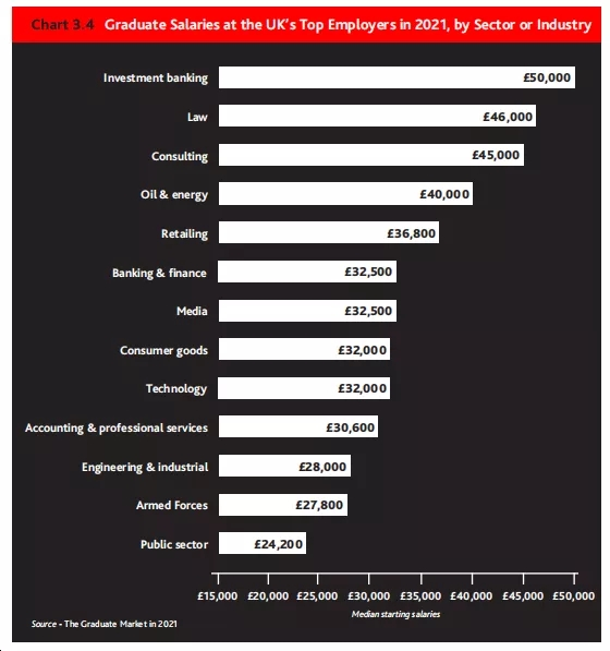 應(yīng)屆畢業(yè)生收入最高的行業(yè)仍是投行,其起薪中位數(shù)為5萬英鎊。頂級(jí)律師事務(wù)所見習(xí)律師的薪資已經(jīng)漲到了4.6萬英鎊,而頂級(jí)戰(zhàn)略咨詢公司的畢業(yè)生薪資目前為4.5萬英鎊。石油和能源行業(yè)、零售業(yè)、科技和媒體公司的中位數(shù)起薪也有所上升。