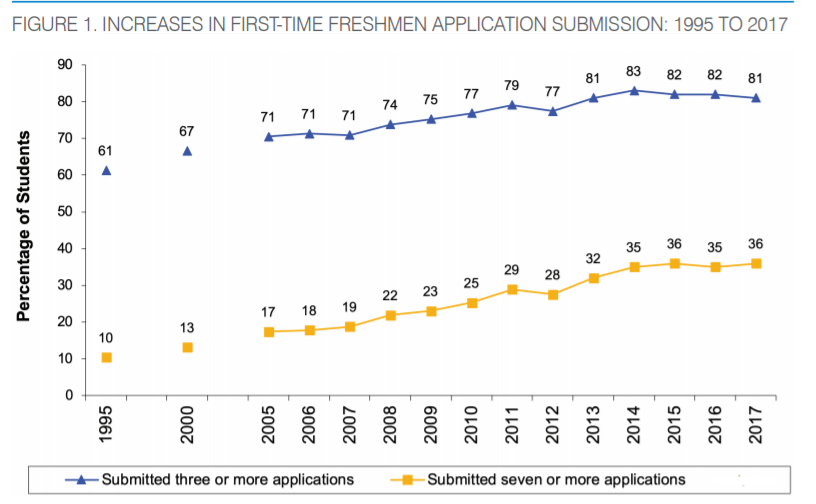 根據(jù)National Association for College Admission Counseling(NACAC)統(tǒng)計,近十年來美國高中生們人均大學申請數(shù)量呈持續(xù)增長趨勢。2017年約有36%的學生申請了超過7所大學,這也意味著這些學生會被不止一所大學錄取。