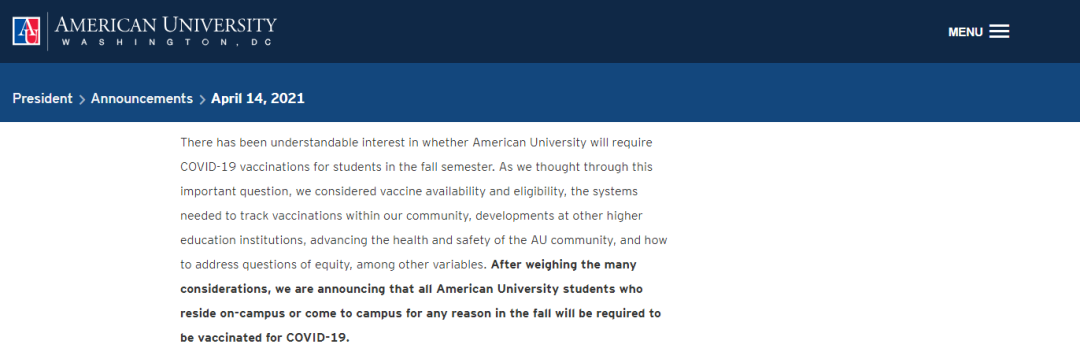 同處于華盛頓D.C.的喬治華盛頓大學(xué)、喬治城大學(xué)、美利堅大學(xué)同樣要求所有秋季返校或住校的學(xué)生都接種疫苗,其中喬治華盛頓大學(xué)對教師、員工也做出強制要求。