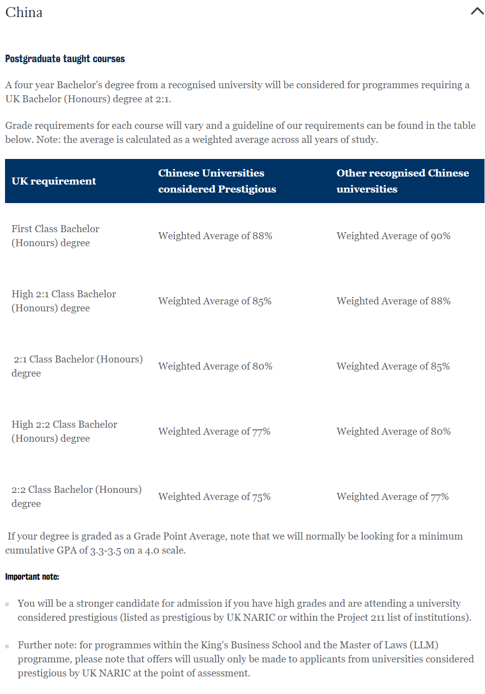 KCL也是沒有內(nèi)部list的,而且對于錄取要求,學校官網(wǎng)有明確的說明,985/211一個分數(shù)擋位,雙非一個分數(shù)擋位,具體如下: