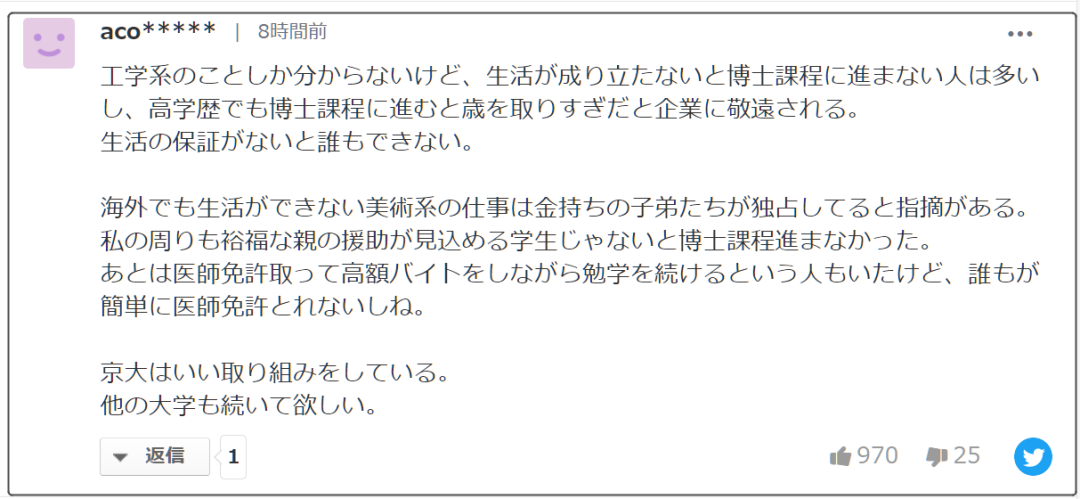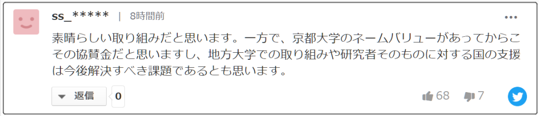 京都大學的湊長博校長在接受朝日新聞的采訪時說:“獎學金給人的印象是,可以通過減少兼職來進行研究。”他說:“我想創(chuàng)造一個良性循環(huán),在這個循環(huán)中,資助學生成長并籌集捐款以培養(yǎng)下一位研究人員。”