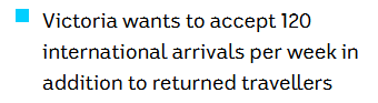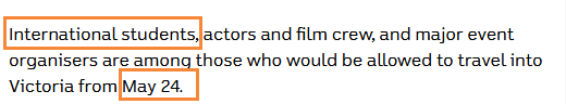 詳細(xì)的方案遞交給了聯(lián)邦政府,預(yù)計(jì)國(guó)際學(xué)生、演員和電影攝制組以及大型活動(dòng)的組織者等人將被允許從5月24日起進(jìn)入維多利亞。