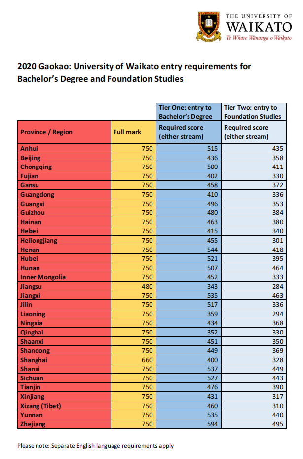 高考直錄:中國(guó)高考達(dá)到一本分?jǐn)?shù)線或?qū)W校規(guī)定的高考總分百分比(Tier One)可直錄新西蘭八所大學(xué)本科。