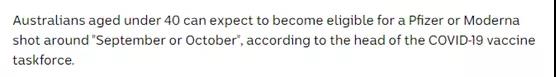 據(jù)新冠疫苗工作組負(fù)責(zé)人稱,40歲以下的澳大利亞人有望在“9月或10月”得到接種輝瑞(Pfizer)或莫德納(Moderna)疫苗的資格。