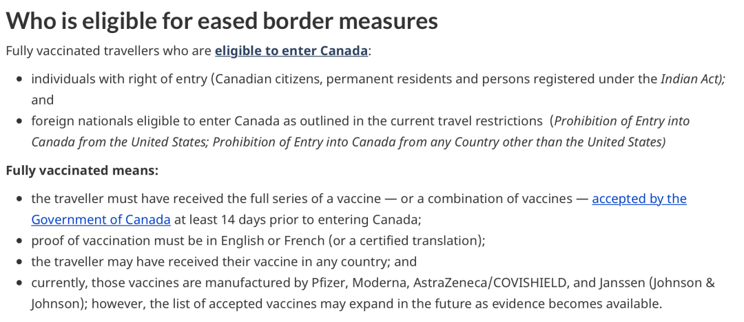 但是,要被視為完全接種疫苗,旅行者必須在進入加拿大前至少14天接種過加拿大政府接受的疫苗或組合。
