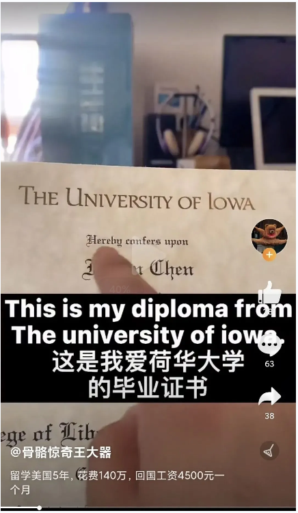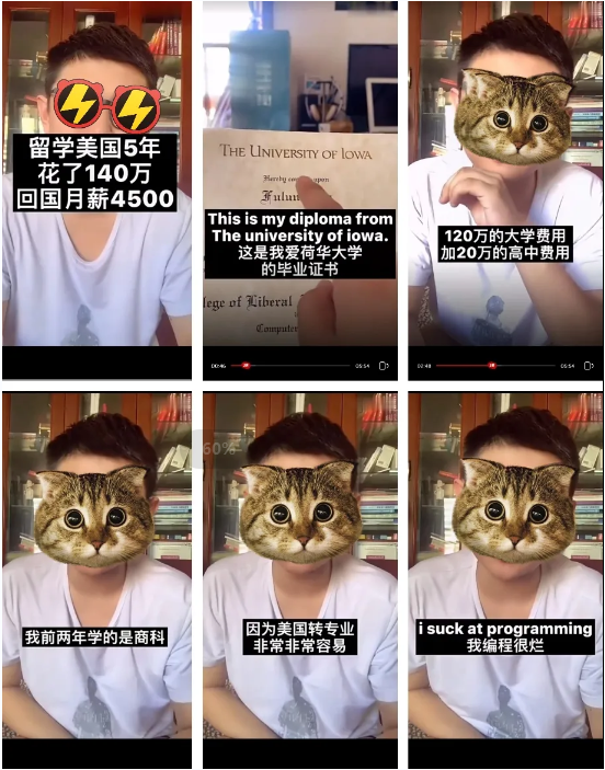 據(jù)視頻中的該小伙自己介紹,他畢業(yè)于美國愛荷華大學(xué),在美國排名70多,相當(dāng)于美國一所普通中等的大學(xué)。為了有個(gè)好的就業(yè)選擇,二年級由商科轉(zhuǎn)入計(jì)算機(jī)科學(xué)專業(yè)。沒想到計(jì)算機(jī)難度大,原本商科全A,到了計(jì)算機(jī)就很吃力了,編程技術(shù)學(xué)的很爛。