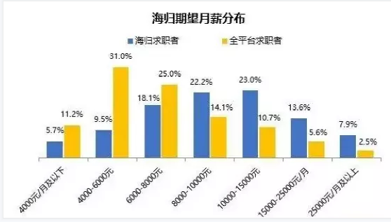 《2020中國海歸就業(yè)創(chuàng)業(yè)調(diào)查報(bào)告》顯示,近9成留學(xué)生回國后選擇就業(yè),薪酬福利成為最看重因素。海歸求職者的期望薪資主要集中在8000—10000元/月與10000—15000元/月,而全平臺(tái)求職者,薪資更多集中在4000—6000元/月,這也成了許多企業(yè)不選擇海歸人才的原因之一。