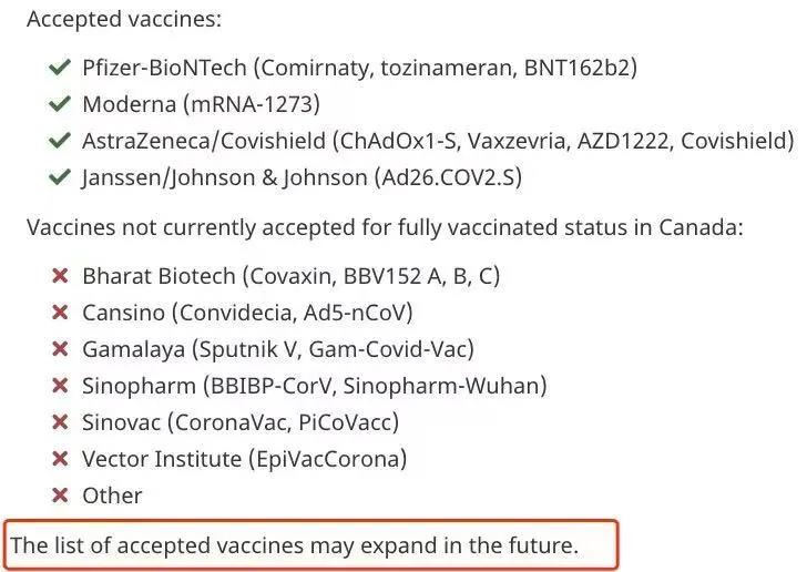 但是,根據(jù)目前加拿大的要求,“完全接種”是指接種了加拿大公共衛(wèi)生部門批準(zhǔn)的四款疫苗,即輝瑞、莫德納、阿斯利康和強生。