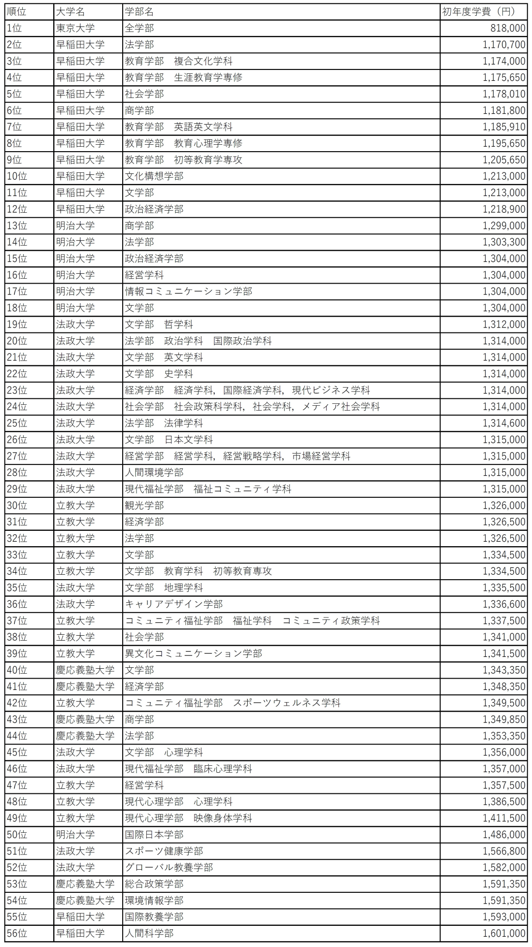 從東京六大學(xué)的各學(xué)部最低和最高學(xué)費來看: