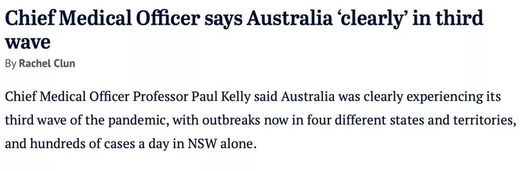與此同時(shí),澳洲首席醫(yī)療官Paul Kelly教授也承認(rèn):目前澳大利亞顯然正在經(jīng)歷第三波疫情,當(dāng)下四個(gè)州都爆發(fā)了疫情,僅新州每天就新增數(shù)百例病例。