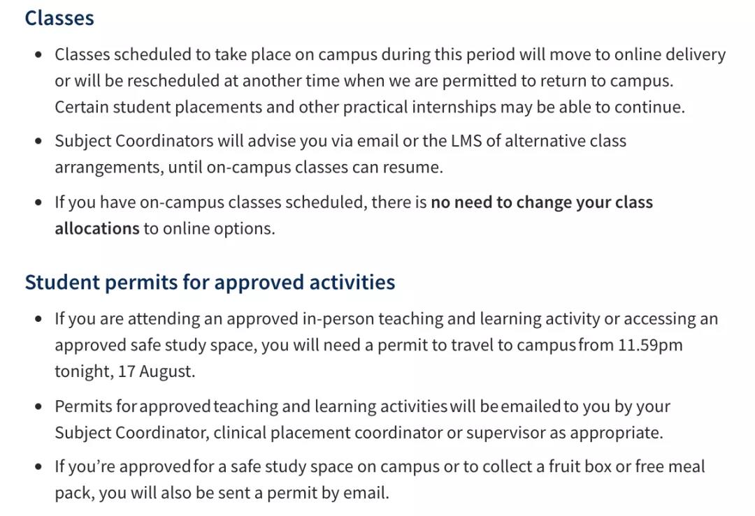 如果正在參加經(jīng)批準的面對面教學和學習活動或進入經(jīng)批準的安全學習空間,則需要獲得許可才能從8月17 日今晚11 點59分起前往校園。