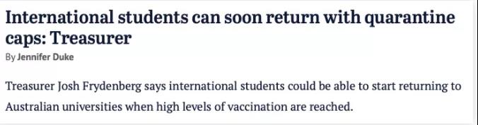 9月6日周一,Josh Frydenberg在澳國(guó)立大學(xué)(Australian National University)的一次電話會(huì)議上表示,當(dāng)澳洲達(dá)到為16歲以上人群接種70%和80%疫苗的目標(biāo)時(shí),就有機(jī)會(huì)重振價(jià)值數(shù)十億澳元的國(guó)際學(xué)生產(chǎn)業(yè)。這些國(guó)際學(xué)生人會(huì)在隔離人數(shù)上限 (quarantine caps)之內(nèi)。