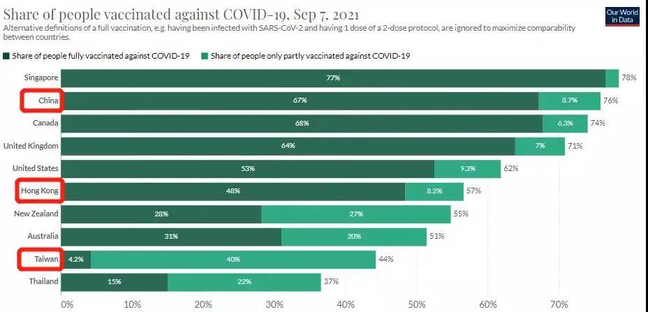 截至9月7日,中國大陸完全接種疫苗的比例已達67%,中國香港地區(qū)48%,中國臺灣地區(qū)4.2%。