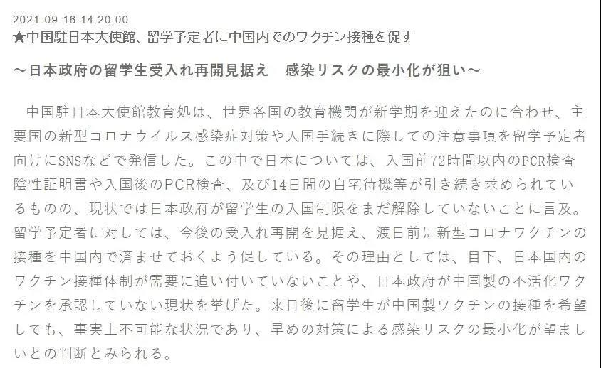 9月16日,日本留學(xué)生新聞網(wǎng)站發(fā)布了一篇新聞,內(nèi)容為中國駐日本大使館呼吁即將赴日的留學(xué)生們盡早接種新冠疫苗,也許這也是日本即將開放國門的一個信號,準備赴日的同學(xué)們?nèi)绻€沒接種疫苗,請盡早將接種疫苗提上日程。以下為留學(xué)生新聞網(wǎng)文章截圖以及譯文: