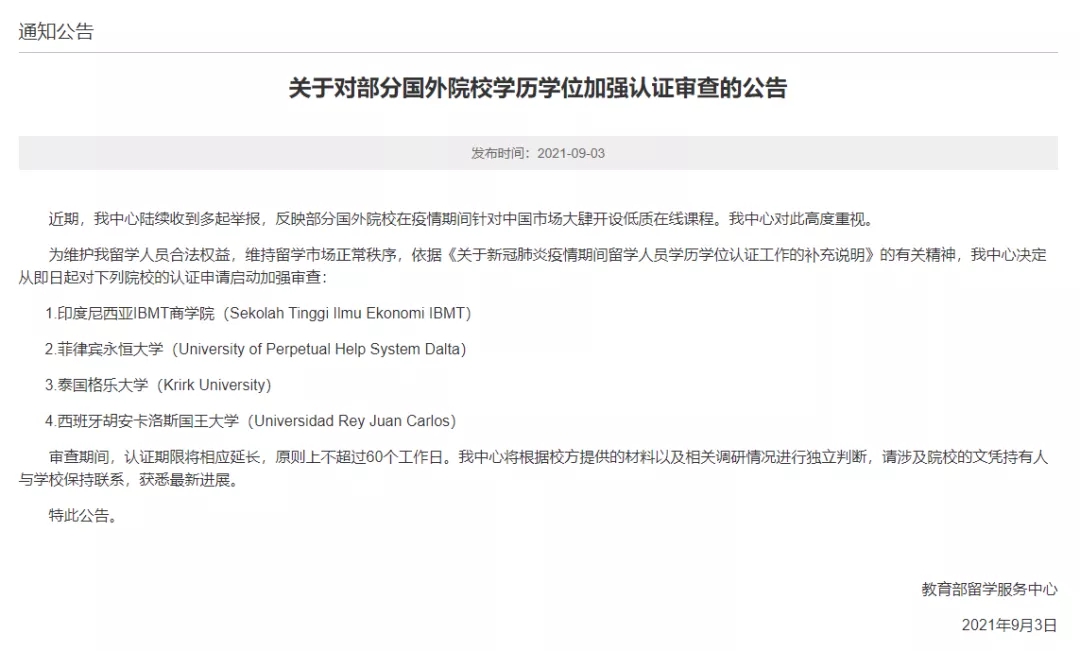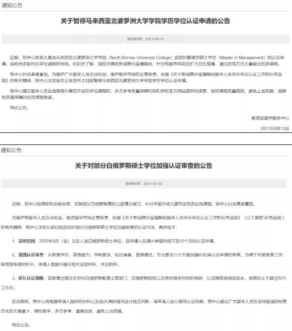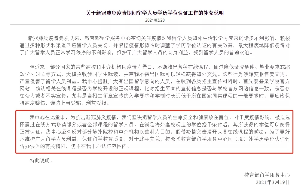 但是近日中國教育部卻接連發(fā)布了多條公告,直指那些在國內(nèi)上低質(zhì)量網(wǎng)課混學歷的“假留學生們”:針對部分高校以疫情為借口,在中國市場大肆開設低質(zhì)在線課程,教育部留學服務中心將對部分國外高校學歷學位加強認證審核!