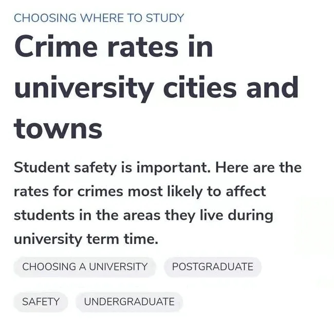 根據(jù)往屆留學(xué)生的反饋,大家普遍感覺:英國對留學(xué)生來說是相對安全的。近日英國CUG《完全大學(xué)指南》調(diào)查發(fā)布了《Crime rates in university cities and towns》——2021年英國大學(xué)周邊犯罪率排名,這里我們就來看下疫情前后英國大學(xué)周邊城鎮(zhèn)的治安情況和犯罪率。