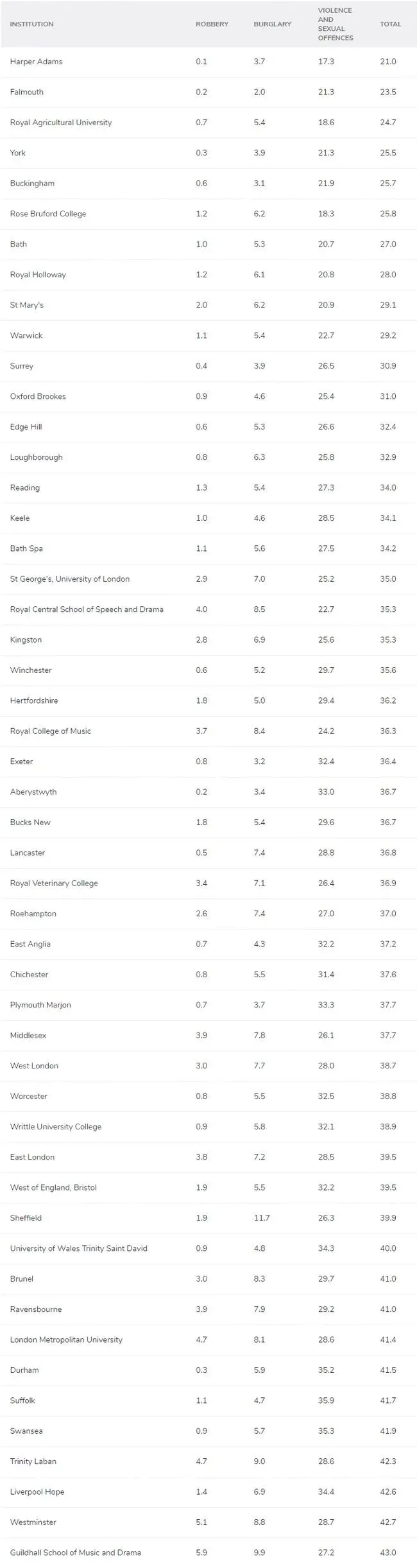 該排名結(jié)合英國警察局、英國國家統(tǒng)計局等機構(gòu)的數(shù)據(jù),整理出了129所英國大學(xué)周邊治安排名。