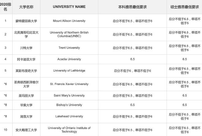 雅思不僅受加拿大院校認(rèn)可,還受到移民局的偏愛,是留學(xué)生簽證申請(qǐng)快捷通道—學(xué)習(xí)直入計(jì)劃(SDS)申請(qǐng)中唯一被認(rèn)可的英語(yǔ)語(yǔ)言成績(jī)。在麥克林加拿大基礎(chǔ)本科類大學(xué)排名中,前20名的學(xué)?;疽笱潘疾坏陀?.5。