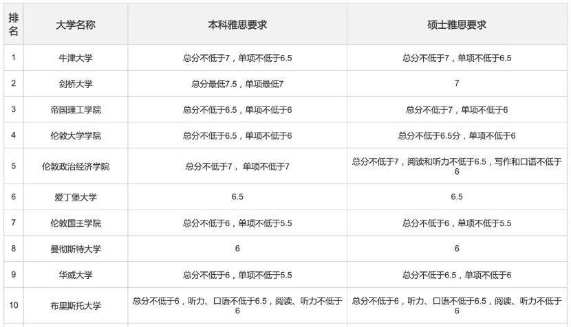 英國(guó)作為雅思考試的發(fā)源地與大本營(yíng),2021全球大學(xué)排名中英國(guó)大學(xué)TOP50均接受雅思成績(jī),甚至有不少排名靠前的學(xué)校僅要求總分6.5分及以下,部分對(duì)單項(xiàng)分?jǐn)?shù)有一定的規(guī)定。英國(guó)留學(xué)