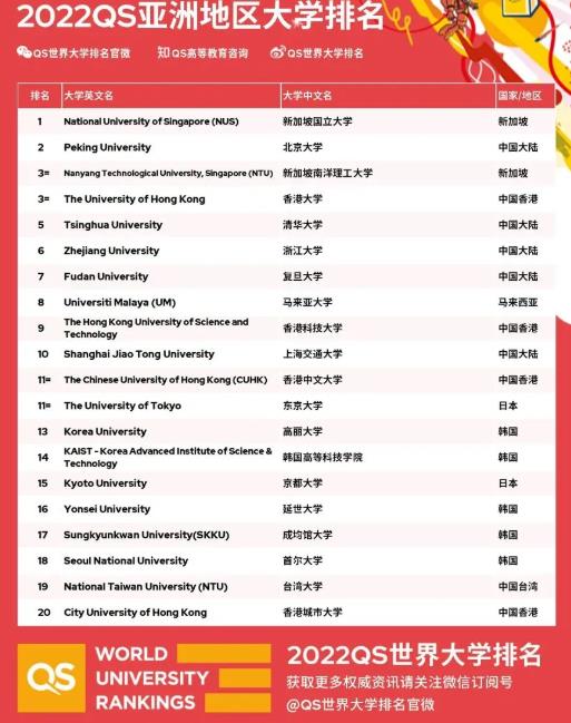 最新2022年QS亞洲地區(qū)大學(xué)排名一覽