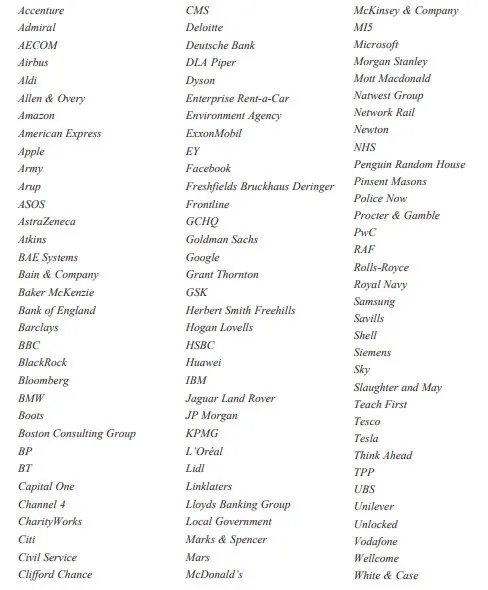 這100家企業(yè)包括亞馬遜、蘋果、谷歌、寶潔、BBC、Facebook、高盛、勞埃德銀行集團(tuán)等等,涵蓋了大多數(shù)行業(yè)的頂尖企業(yè)。萬佳留學(xué)