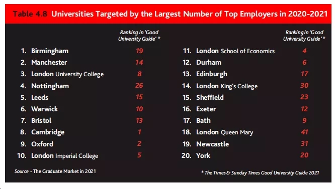2021年英國畢業(yè)生就業(yè)市場報告,依舊公布了受頂級雇主青睞的英國大學(xué)榜單。