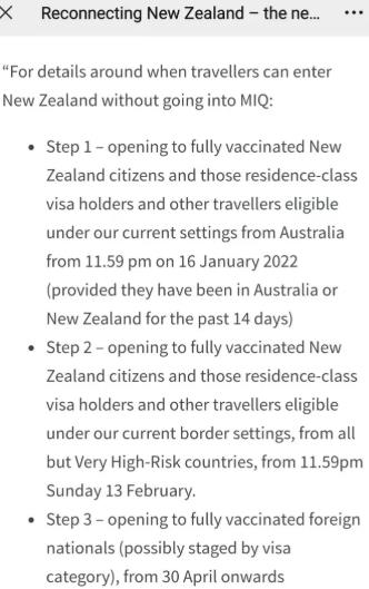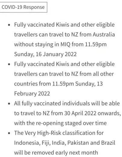 自2022年2月13日(星期日)晚11時(shí)59分起,上述類(lèi)別符合要求者可以從澳大利亞以外的所有其他國(guó)家前往新西蘭;