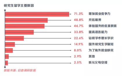從上圖可以看出,大部分選擇同學(xué)出國(guó)深造最終目的是增加就業(yè)競(jìng)爭(zhēng)力。隨著社會(huì)進(jìn)步和發(fā)展,各企業(yè)對(duì)員工的要求也越來越高,尤其是大公司/知名企業(yè)。雖然國(guó)家號(hào)召985或211的硬性門檻要求逐漸被淡化,但是“隱形門檻”仍然存在,若選擇國(guó)外排名較高的大學(xué)深造讀研,可以有效地彌補(bǔ)學(xué)歷背景上的不足,提高個(gè)人競(jìng)爭(zhēng)力。