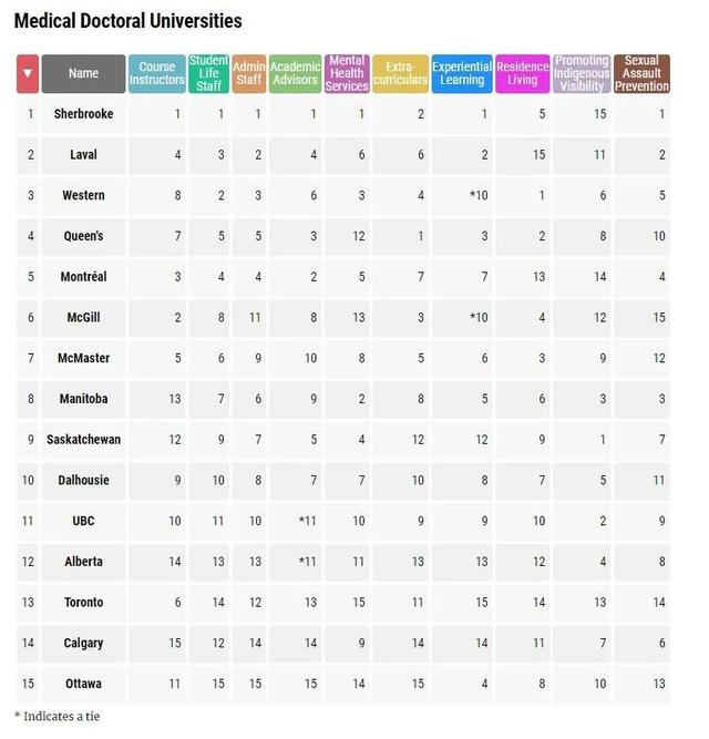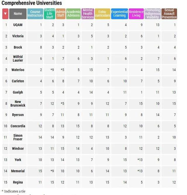 對比去年,去年的第一名圭爾夫大學跌到第七位,與去年的第四名魁北克大學今年奪冠!去年第八名的維多利亞大學躍升到第二位!而布魯克大學則是去年的第二名!有趣的是倒數(shù)三位的排名沒有改變!