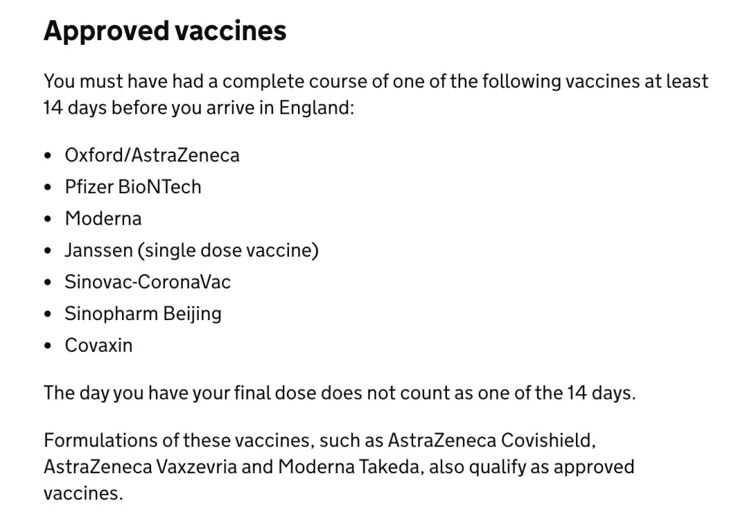 抵達(dá)英國(guó)同樣需要完全接種疫苗(多針疫苗需要在抵達(dá)英國(guó)前14天完成最后一針注射),但目前中國(guó)只有臺(tái)灣和香港地區(qū)的科興和北京國(guó)藥是認(rèn)證的,如果是在大陸和澳門地區(qū)注射的疫苗,仍然需要入境前48小時(shí)的核酸陰性檢測(cè)報(bào)告,并預(yù)定到達(dá)英國(guó)后的兩劑核酸檢測(cè)包(day2+day8)萬(wàn)佳留學(xué)