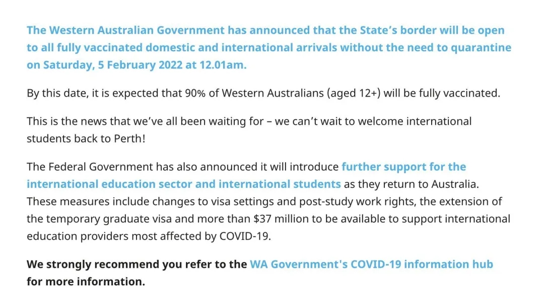 截止12月21日,西澳大學(xué)官網(wǎng)發(fā)布最新留學(xué)生返澳政策。最新政策表明,現(xiàn)進(jìn)入ACT政府不再要求完全接種TGA認(rèn)可疫苗的學(xué)生進(jìn)行72小時(shí)隔離。完全接種指2次全計(jì)量疫苗之間至少間隔14天,在完成接種過(guò)程后至少過(guò)去7天。