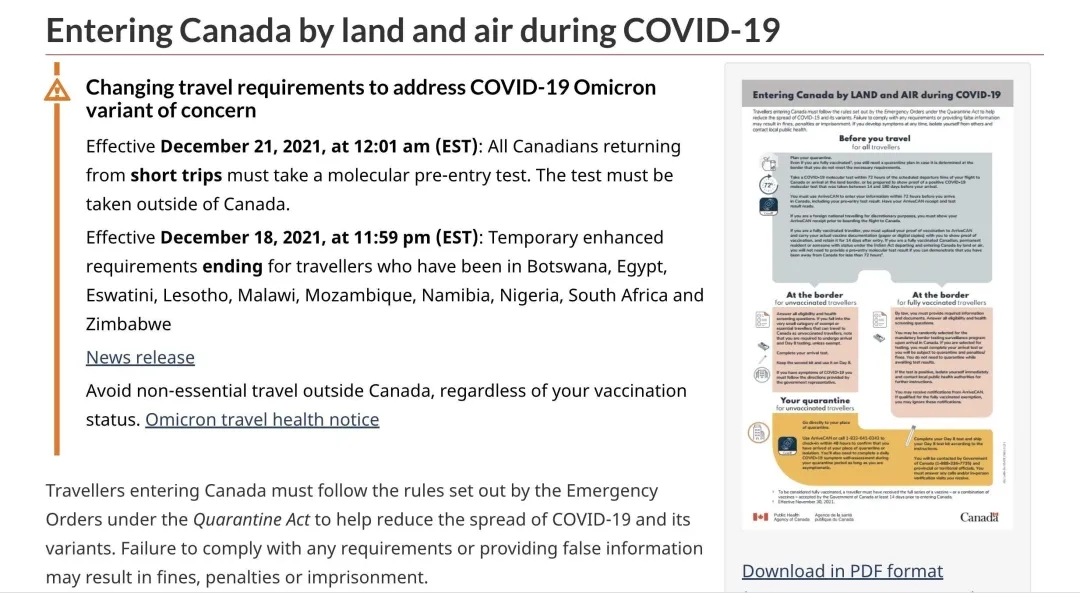 加拿大官方于12月21日發(fā)布:從12月21日上午12:01(美國(guó)東部標(biāo)準(zhǔn)時(shí)間)開(kāi)始,所有入境加拿大的民眾都需要提供72小時(shí)內(nèi)的陰性核酸檢測(cè)報(bào)告。