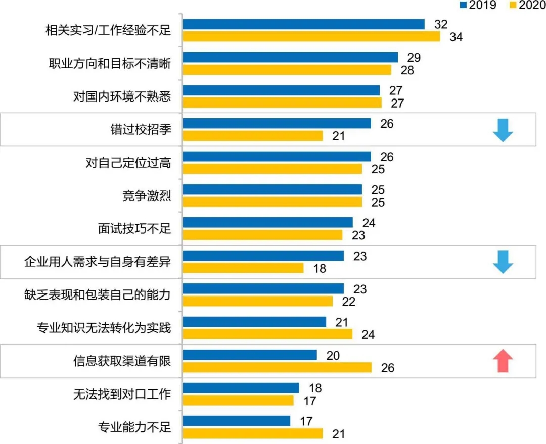 另外,“職業(yè)發(fā)展方向和目標(biāo)不清晰”,“對(duì)國內(nèi)環(huán)境不熟悉”,“信息渠道獲取有限”都是當(dāng)今留學(xué)生求職困難的主要原因,這也反映了留學(xué)生們?cè)谠缙诘穆殬I(yè)規(guī)劃意識(shí)不足的情況。