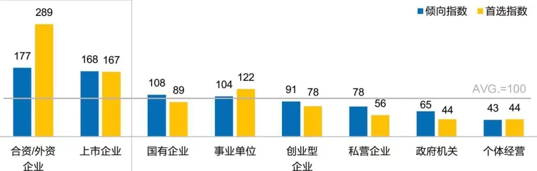 在企業(yè)類型上,合資/外資企業(yè)由于氛圍、員工構(gòu)成更加國際化,是留學(xué)生回國就業(yè)的首選,第二受歡迎的是上市企業(yè)。國有企業(yè)、事業(yè)單位這樣穩(wěn)定的“體制內(nèi)”工作也開始更加受到留學(xué)生擇業(yè)的歡迎。