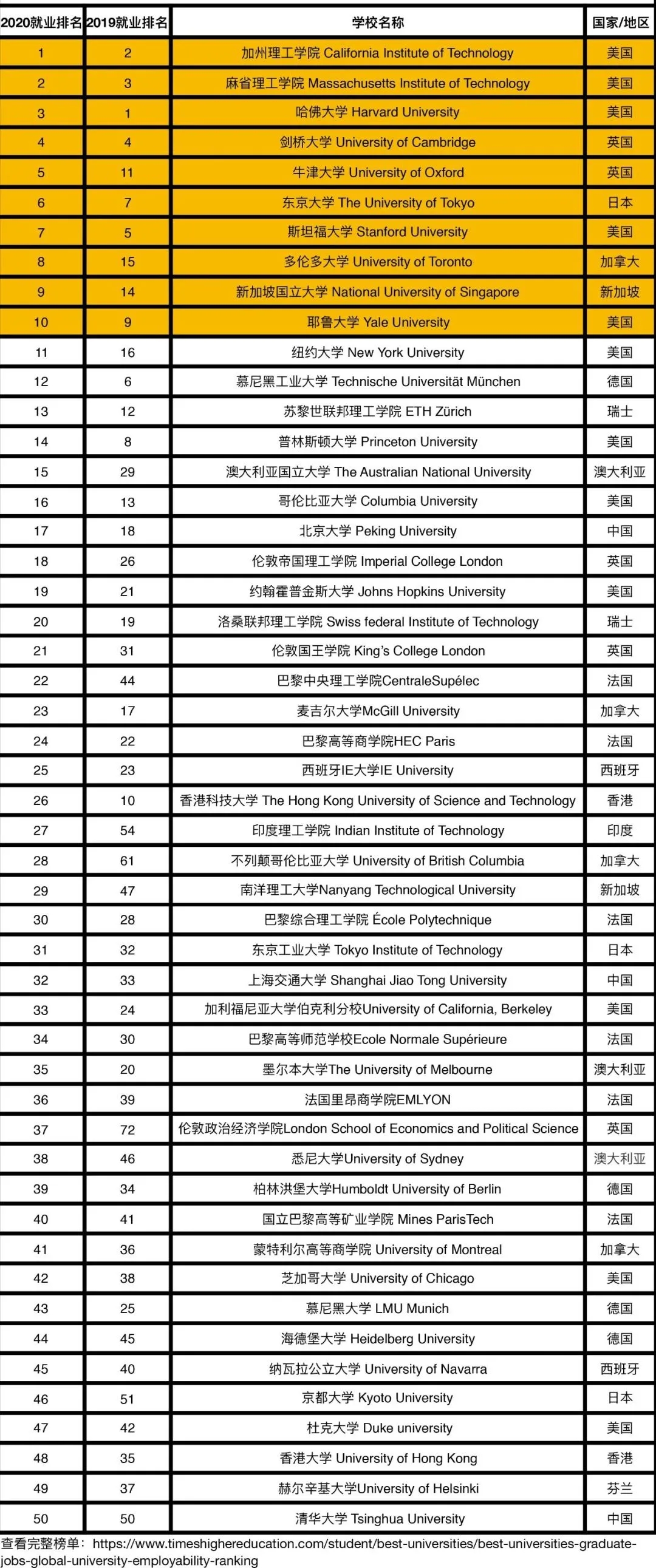 2020THE全球大學(xué)就業(yè)力排名TOP50