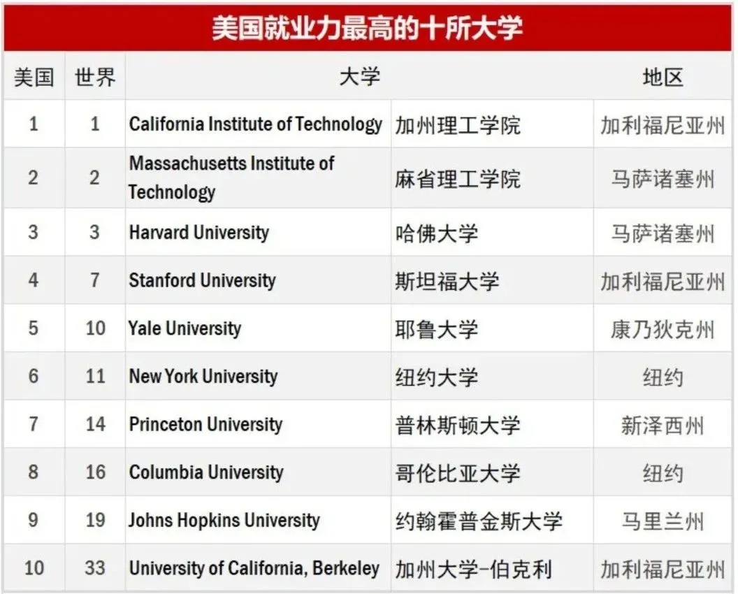 在全球大學(xué)就業(yè)力排名前十的院校中,美國占據(jù)5個(gè),依次為前三甲的加州理工學(xué)院(California Institute of Technology)、麻省理工學(xué)院(Massachusetts Institute of Technology)和哈佛大學(xué)(Harvard University),以及排在第七的斯坦福大學(xué)(Stanford University)和排在第十的耶魯大學(xué)(Yale University)第十。