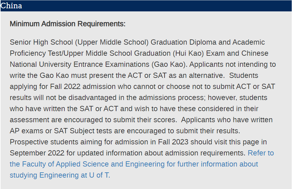 多倫多大學(xué)對中國普高申請人的要求是:必須提供會考成績、高考成績和高中畢業(yè)證明。如果普高申請人沒有完成高考,則必須參加SAT/ACT等標化考試來取代高考。