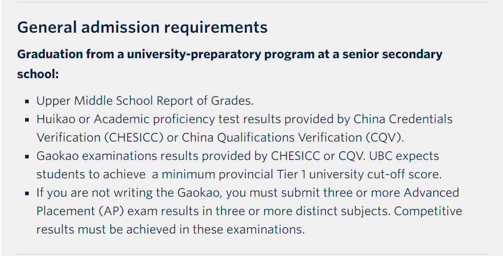 UBC明確指出,高考成績必須在一本線上。如果沒有參加高考,UBC要求申請人需要提供至少三門不同課程的AP成績。