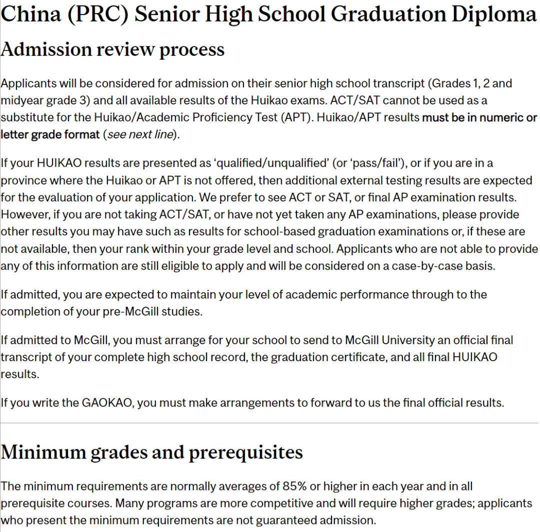 中國普高申請人在申請麥吉爾大學(xué)時必須提供:平時成績、會考成績以及高考成績。