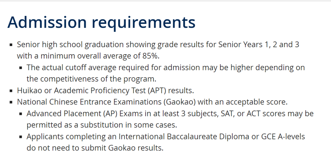 對于高考成績有Acceptable score的要求,不是很明說,但是既然對于整個高中的GPA要求是85以上,我們基本也可以認為,最好達到省一本線,這樣才比較有競爭力。