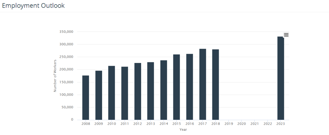 注冊護士在澳洲是從業(yè)人數(shù)最多的群體之一,統(tǒng)計數(shù)據(jù)顯示2018年注冊護士達到27.96萬,預(yù)測至2023年,護士就業(yè)人數(shù)將增長至33.01萬人,可以看出澳洲將來對于護士的需求量將非常高。