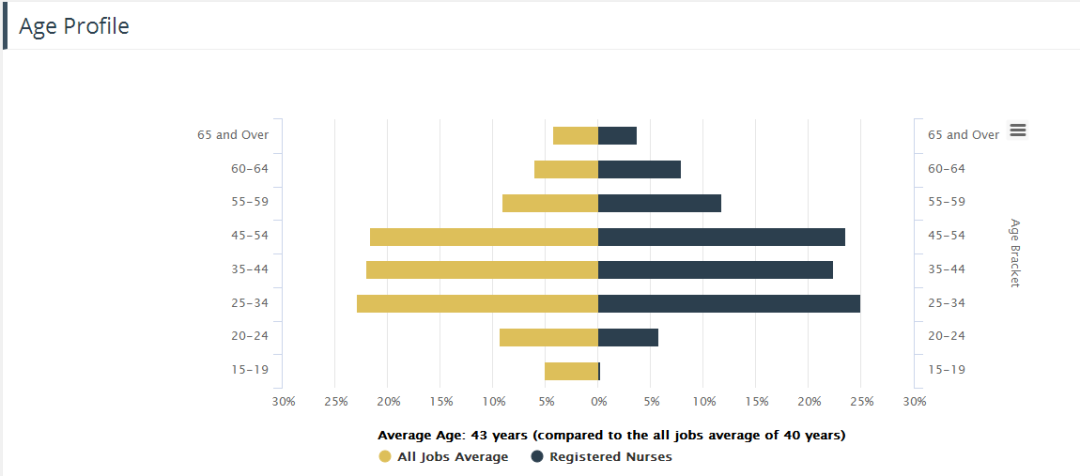 注冊護士的平均年齡為43周歲(所有行業(yè)平均:40歲),從業(yè)者主要集中在25-54歲,算是一個比較穩(wěn)定的職業(yè)。