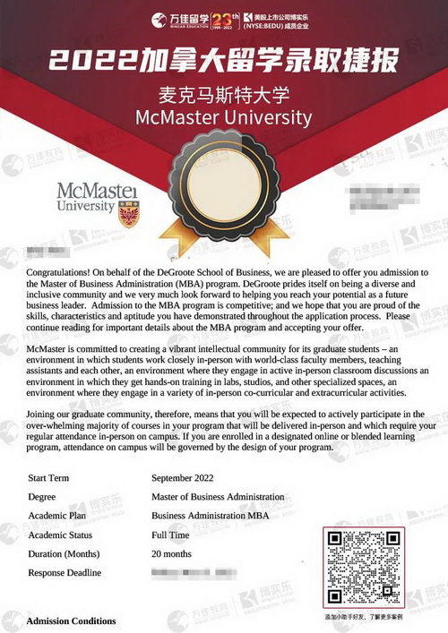 也因?yàn)檫@個(gè)原因,學(xué)生有了信心也燃起了新的希望,積極的跟學(xué)校保持溝通,準(zhǔn)備考試,也希望不辜負(fù)學(xué)校的破例機(jī)會(huì),最終在5月難忘的一天,迎來(lái)了麥克馬斯特大學(xué)商學(xué)院的錄取。
