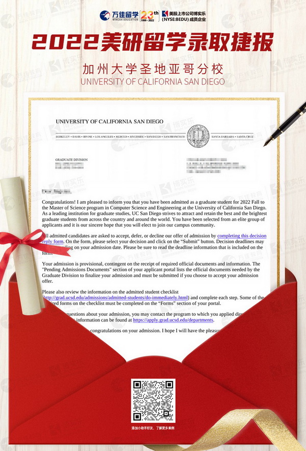 學(xué)生的另外一位老師、是目前與University of Michigan,Ann Arbor聯(lián)合開發(fā)無人車項目的一位教授,兩位非常有含金量的大牛教授的牛推也為申請起到了極大的幫助作用,功夫不負(fù)有心人,不僅拿到了西北大學(xué)的錄取、而且驚喜是一波又一波,最終成功拿到了美國計算機(jī)TOP3名校UCSD的錄取。