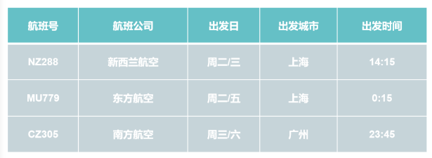 目前從中國(guó)大陸地區(qū)直飛新西蘭的航班有三個(gè)航線,分別由新西蘭航空、中國(guó)東方航空及中國(guó)南方航空直飛,2022年7月航班時(shí)刻供參考,具體時(shí)間請(qǐng)以航空公司公布信息為準(zhǔn):