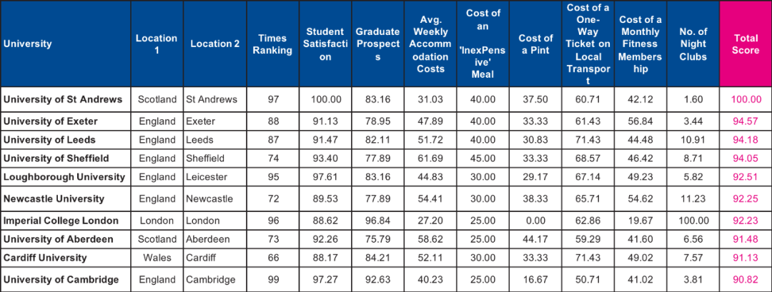 本次排名綜合了泰晤士高等教育排名、學(xué)生滿意度、畢業(yè)生前景、住宿費(fèi)用、交通費(fèi)用等多維度的指標(biāo)考察,為學(xué)生篩選出了最好的學(xué)習(xí)地點(diǎn)。
