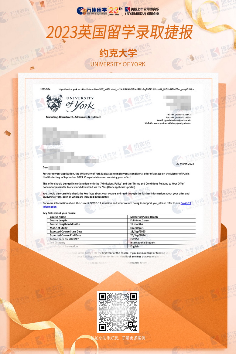 雖然本科學校背景一般、均分低,但是學生也有他獨特的優(yōu)勢。雖然有些學校婉拒了,但是英國約克大學感受到了孩子的努力和執(zhí)著,破格給予了錄取,無疑增加了孩子雅思學習的信心!在拿到offer的同時當月就報名了雅思,最后也符合了約克大學的語言要求,順利入讀心儀夢校。