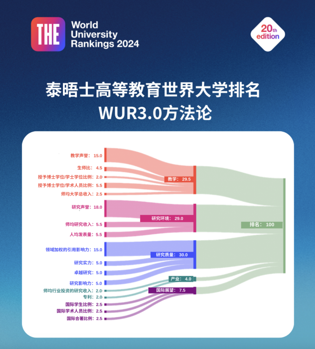 2024年,泰晤士學(xué)科排名采取與2024世界大學(xué)排名相同的18項表現(xiàn)指標(biāo),并分為5大一級指標(biāo):
