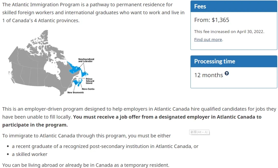 加拿大移民局在2017年推出的大西洋四省移民試點項目(Atlantic Immigration Pilot Program、AIPP)。而后在2022年大西洋移民計劃(Atlantic Immigration Program)正式取代了試點計劃,成為永久性項目。