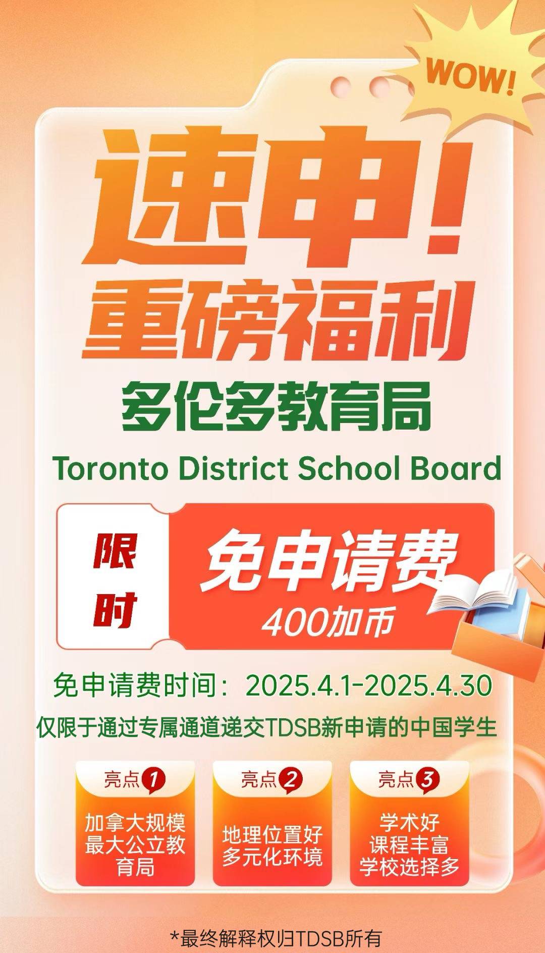 4月30日之前通過我們遞交的多倫多教育局申請,將獲得減免400加幣申請費(fèi)的重磅福利。如需參加此次活動(dòng),需要盡快準(zhǔn)備材料啦!歡迎私信咨詢~